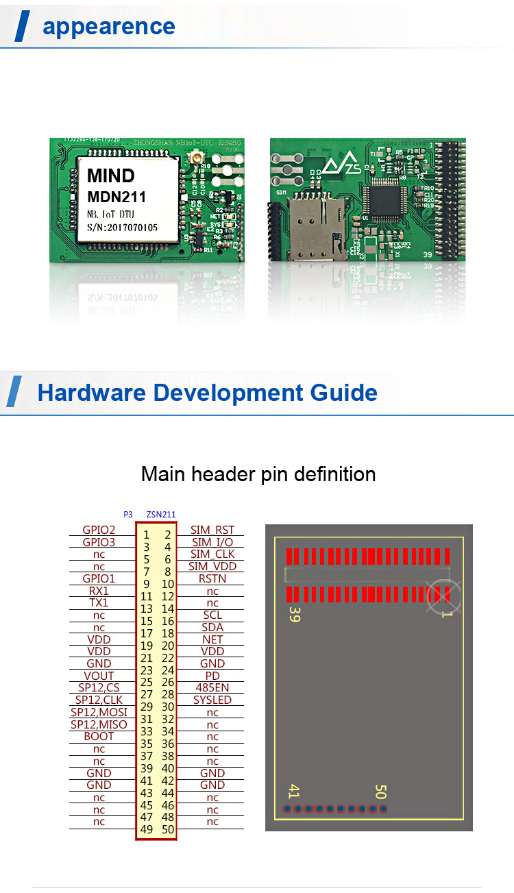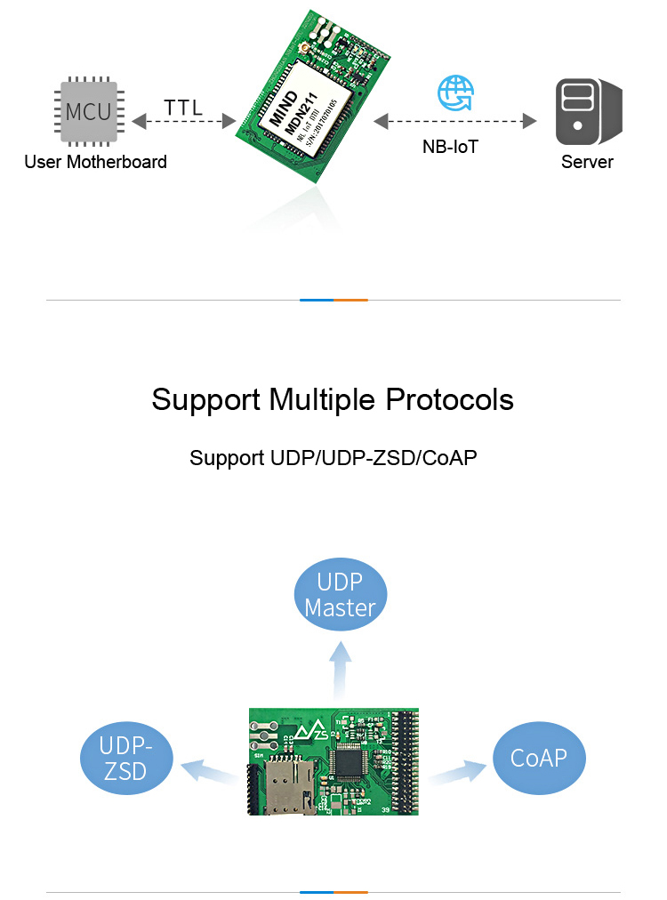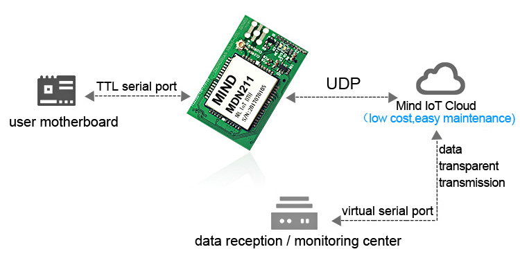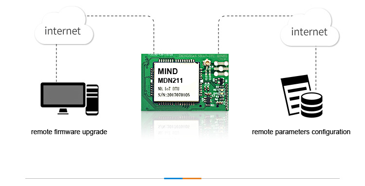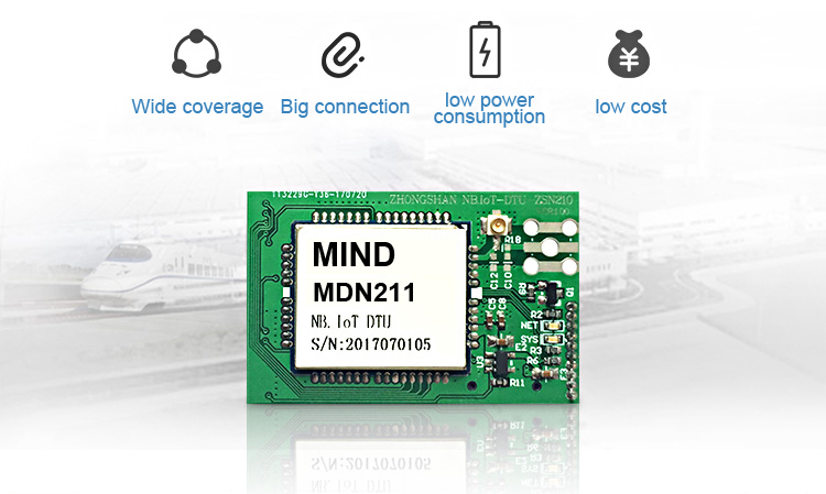 MDN211 NB-IoT DTU is a embedded terminal based on the NB-IoT for wireless data transmission, small volume,simple port, users can easily integrate it into their motherboard;support the online,IDLE,PSM status, get the lower standby power consumption with a few uA; Support UDP network protocol, providing the fully transparent data transmission mode for users; Support customized heartbeat packet,registration packet,header; Support our self-built IoT Cloud without building server by users; Fully support industrial SCADA, users needn’t care of the complex network protocol, just by full transparent transmission serials you can achieve wireless data sending&recei, making your device connect into Internet without the limitation of time or place.