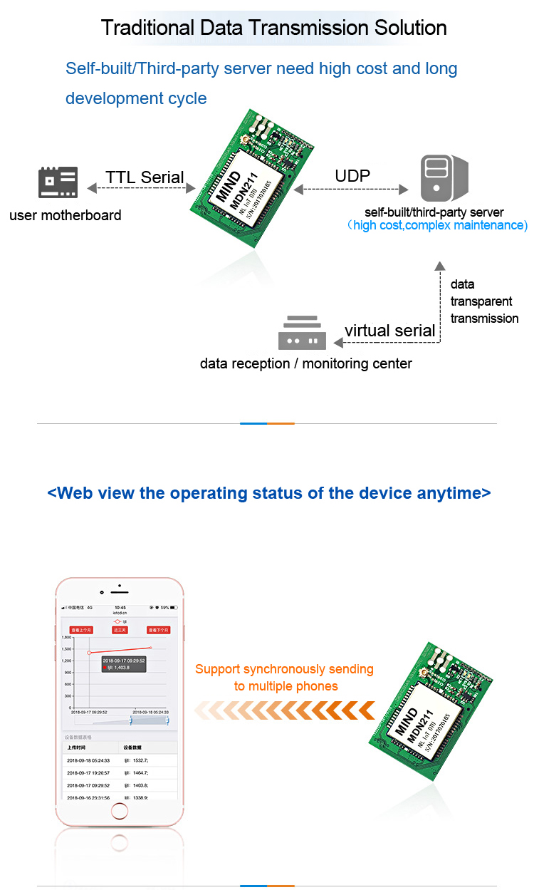 Support Mind IoT Cloud without building server by users,user can use our Cloud transparent transmission technology without the fee of server so that reduce cost.